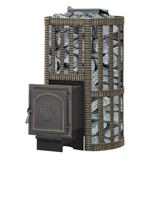 Банная чугунная печь Ураган Ковка 22 (271) укомплектована чугунной герметичной дверцей Везувий 271. Закрытая каменка изготовлена из стали и вмещает в себя не менее 60кг камней.  Конвекционно-вентилируемый кожух "Ковка" изготовлен из металлической текстурированной полосы покрашенной термостойкой краской и покрытая патиной «Бронза».